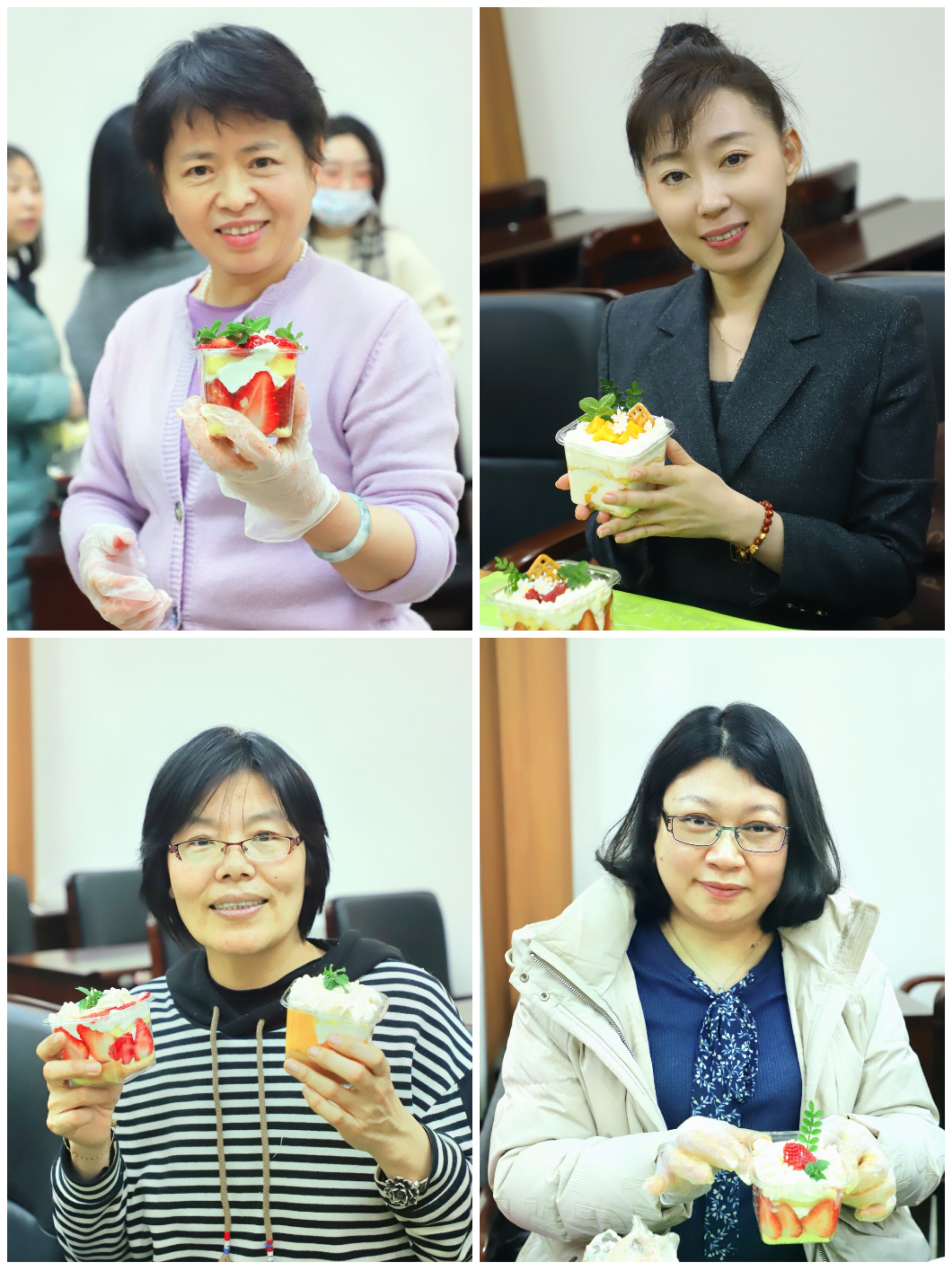 在王欣老师的指导下,老师们相互分工完成了蛋糕坯加工、装饰水果切块、动物奶油打发等步骤,并根据个人喜好制作了属于自己的独一无二的蛋糕。在充满奶香气息的活动现场,大家欢声笑语、气氛热烈,共同享受属于女性教职工的惬意时光。