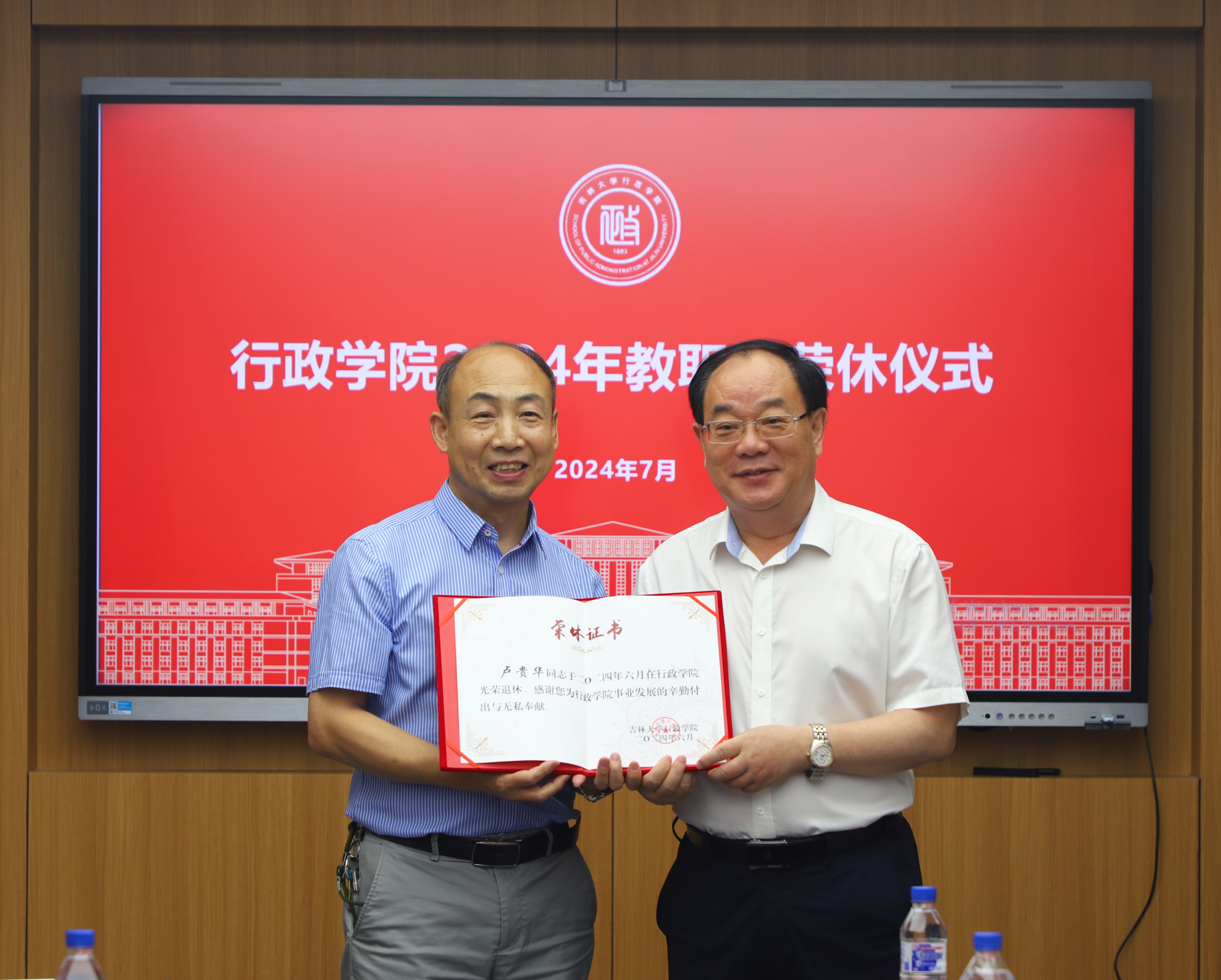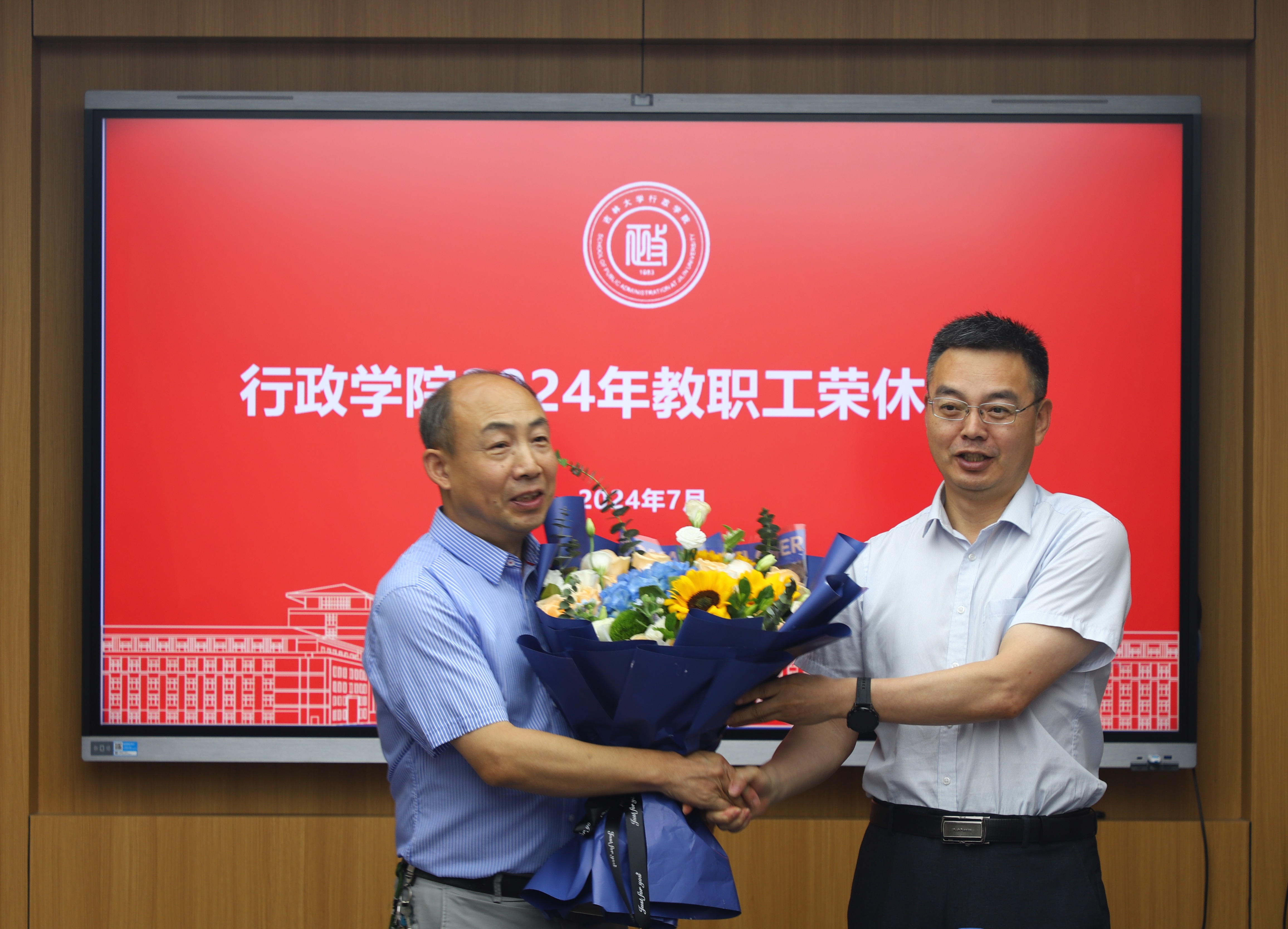 从事行政管理工作二十四载的精彩瞬间。张贤明为卢贵华颁发荣休证书,陈希贵为卢贵华献上祝福的花束,并合影留念。与会人员分别发言,回忆与卢贵华老师共同工作的美好岁月,感谢卢贵华老师为学院无私的奉献,并祝福他在今后的日子里身体健康、生活幸福。