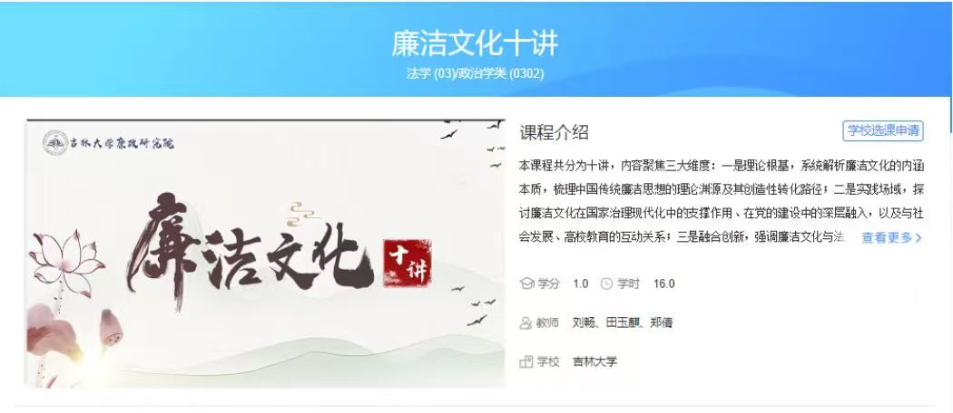 研究生公共选修课课程体系,并列入吉林省《关于进一步加强廉洁文化建设的通知》的推广学习课程,在全省范围内进行播放。该课程旨在以系统化课程重构、学科化教学创新、智库化成果转化推动廉洁文化教育提质增效,为廉政学学科回应党和国家战略需求及高层次人才德育培养提供学理支撑、价值涵育和实践范本。