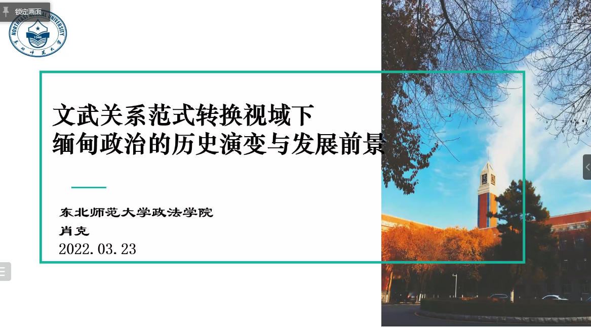 国际事务工作坊第12期学术活动在腾讯会议平台举行。本期工作坊邀请东北师范大学政法学院教授、博士生导师肖克老师担任主讲嘉宾,进行题为“文武关系范式转换视域下缅甸政治的历史演变与发展前景”的学术讲演。天津师范大学政治与麻豆