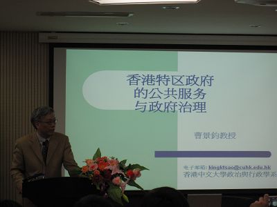 曹景钧教授是研究中国人事制度、公共政策、行政改革方面的专家,今年正值香港回归十五周年,曹景钧教授就香港特区政府的公共服务与政府治理为同学们作了学术报告。首先,曹景钧教授对香港的有关发展背景作了简要的介绍,香港在英国的管制下很多年,其体制受英国的影响很大,一国两制、港人治港是一个很重要的历史的和政治的选择。