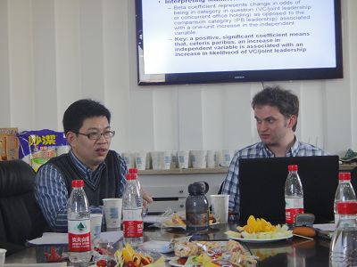 芝加哥大学政治学系Travis Warner博士做了题为“Patterns of Authority and Governance in Rural China: Who’s in Charge? Why?”的学术演讲。Travis Warner首先介绍他所研究的主题,提出了他对中国村庄民主治理研究的四个假设,并在此基础上介绍了他所参与的团队通过问卷访谈获得了数据和信息,依赖这些数据和信息来逐一对四个假设进行验证和最后所得出结论。Travis Warner认为,根据他所参加的工作团队的问卷访谈,四个假设中的三个已得到很好验证,即乡镇政府越依赖于乡村干部,他们就向村干部施加越多的压力,村党支部就越倾向于强化权力;村民集体行动能力越大,村民委员会享有的权力越多;村民委员会的选举方式越具民主性,权力就越会更多地流向村民委员会。