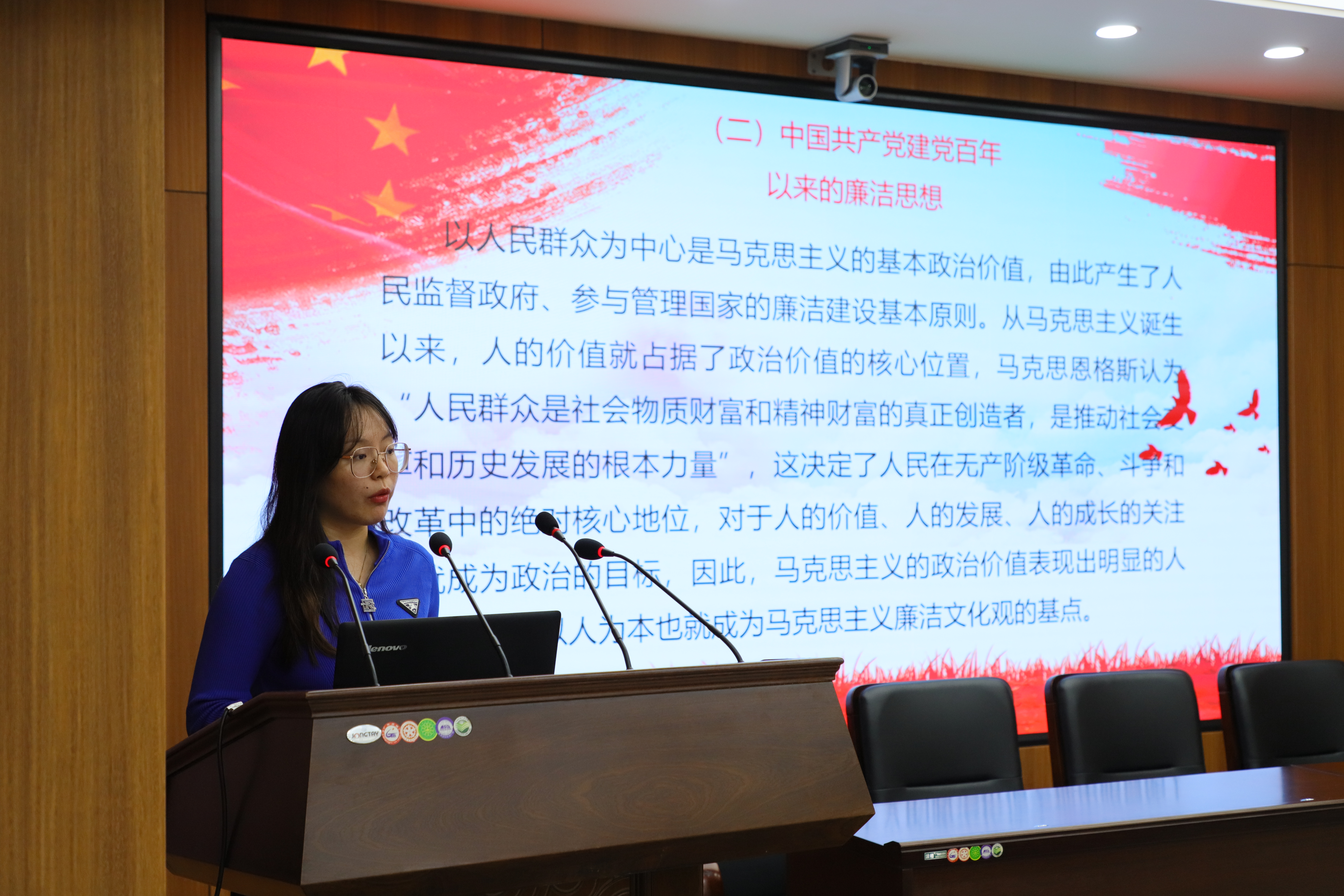 王馨雨以“弘扬廉洁文化,共建和谐校园”为主题,讲解中国优秀传统文化中的廉洁思想、中国共产党建党百年以来的廉洁思想以及习近平新时代中国特色社会主义廉洁思想,帮助同学们提升对于廉政文化的认知和理解。
