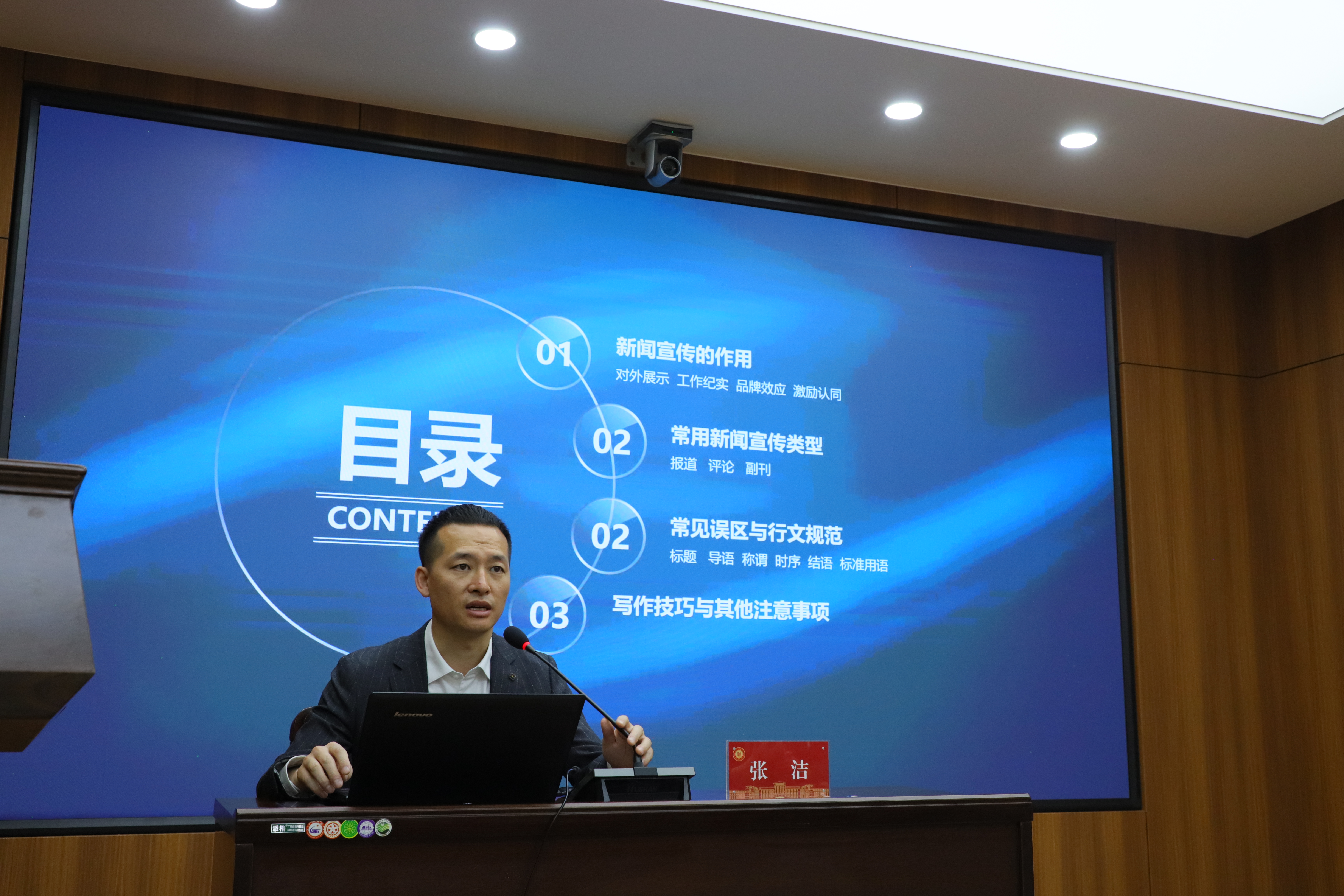 张洁分别讲述了新闻宣传的作用、常用新闻宣传类型,常见误区和行文规范、写作技巧和其他注意事项等四个方面的内容,并结合新闻报道实例详细讲解了用语用词规范等问题。张洁希望同学们能够学以致用,对今后的新闻撰写工作有所帮助。