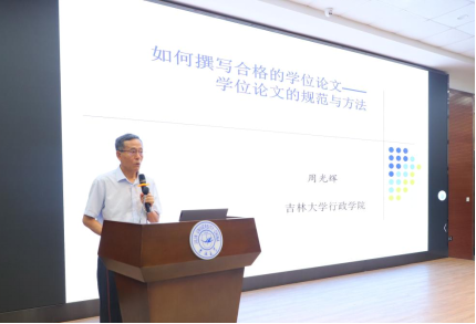 随后,周光辉详细讲解了学位论文写作的基本规范和撰写方法。在学位论文的基本规范方面,周光辉分别从学位论文的质量评价标准、基本格式以及优秀学位论文的核心标准进行讲述,其中特别强调了学位论文的创新性。他认为,创新是衡量论文质量的核心要素,学位论文的撰写不仅是对学术规范的遵循,更是对知识生产和创新能力的体现。因此,他鼓励同学们在学术探索中勇于超越现有认识,不断探索未知领域。