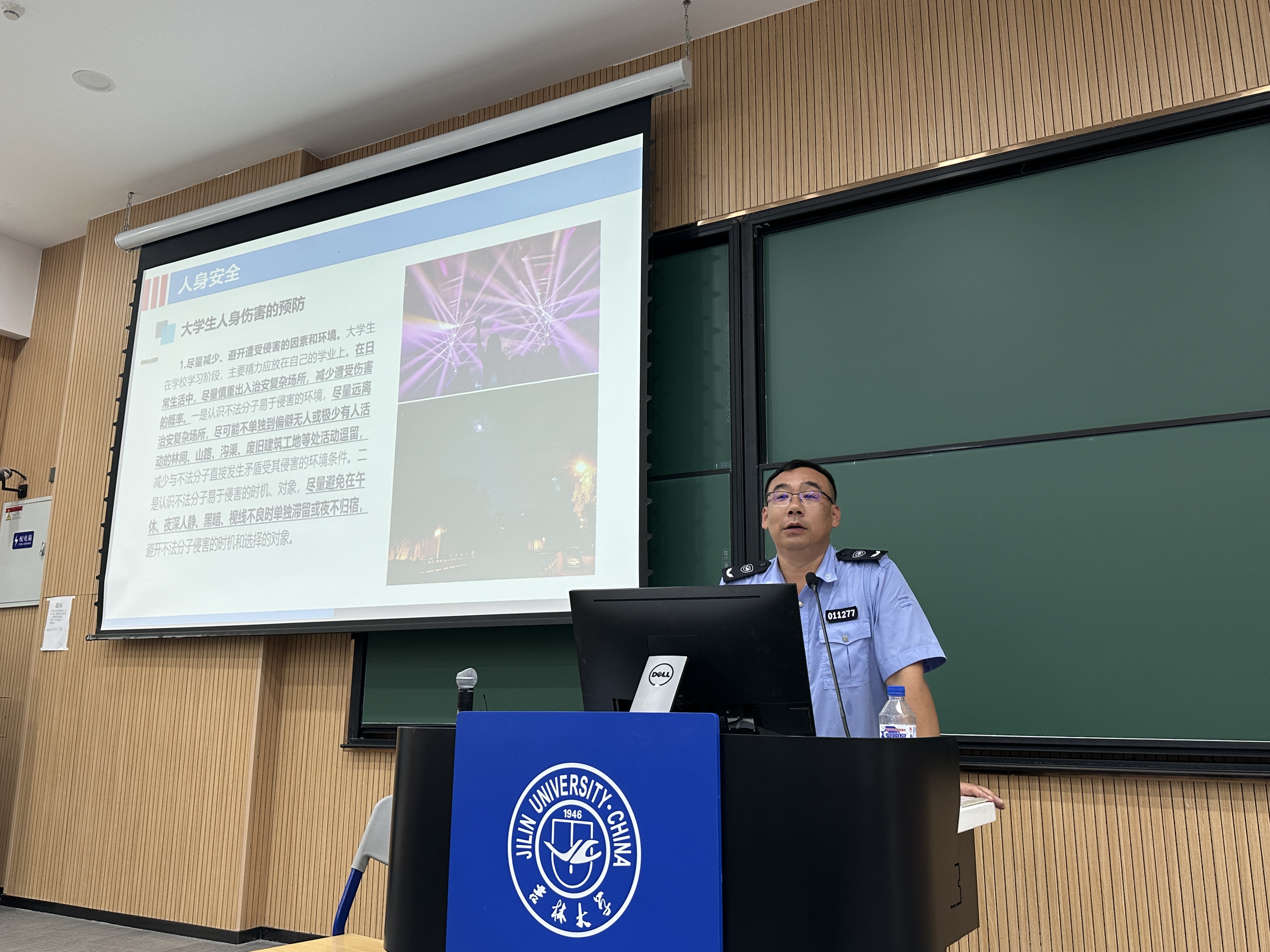 卢阳首先从人身安全出发,对校园交通问题、寝室相处问题、毒品问题、传销问题等人身安全问题进行讲解。随后,他围绕财物安全进行介绍,针对校园中的图书馆、教学楼、体育场等场所的盗窃问题提出了一些建议,并介绍了发生盗窃案件的应对方法。他还建议新生要树立牢固的自我防范意识,“人防”远大于“物防”与“技防”。最后卢阳通过列举近年来发生的一系列各类电信网络诈骗案例,向新生展示了诈骗分子的常见手段和伎俩。他特别提醒,刚入学的同学在遭遇形形色色的诱惑与各类陷阱时,务必保持清晰的判断。对于不熟悉之人的言语,切勿轻易相信;个人的私密信息,也绝不能随意告知他人。一旦发现反常或可疑的情况,要迅速联系学校保卫部门,或是向当地公安机关请求支援。最后,他激励新生们主动融入校园安全建设的行列,携手构建起安全有序、氛围融洽的校园学习与生活空间。
