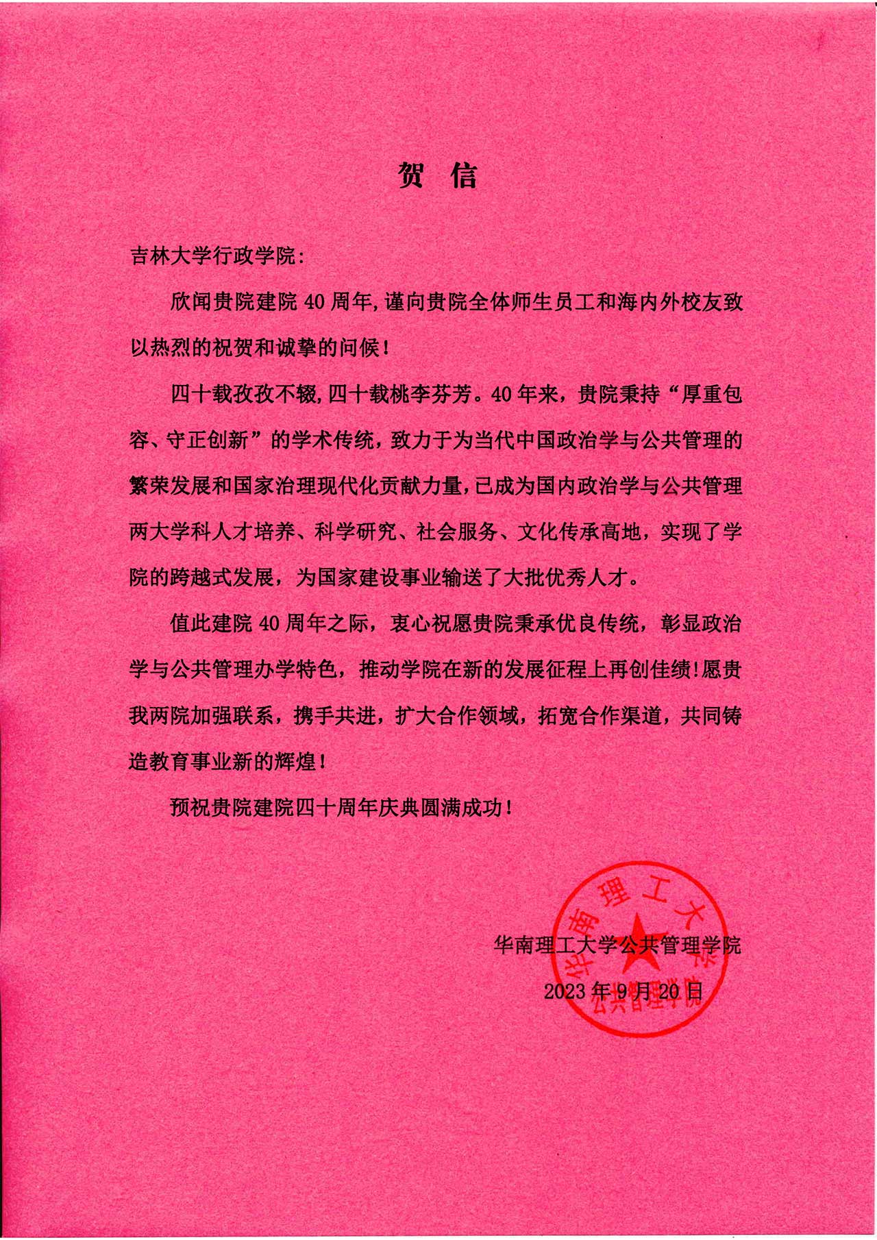 华南理工大学公共管理学院的贺信