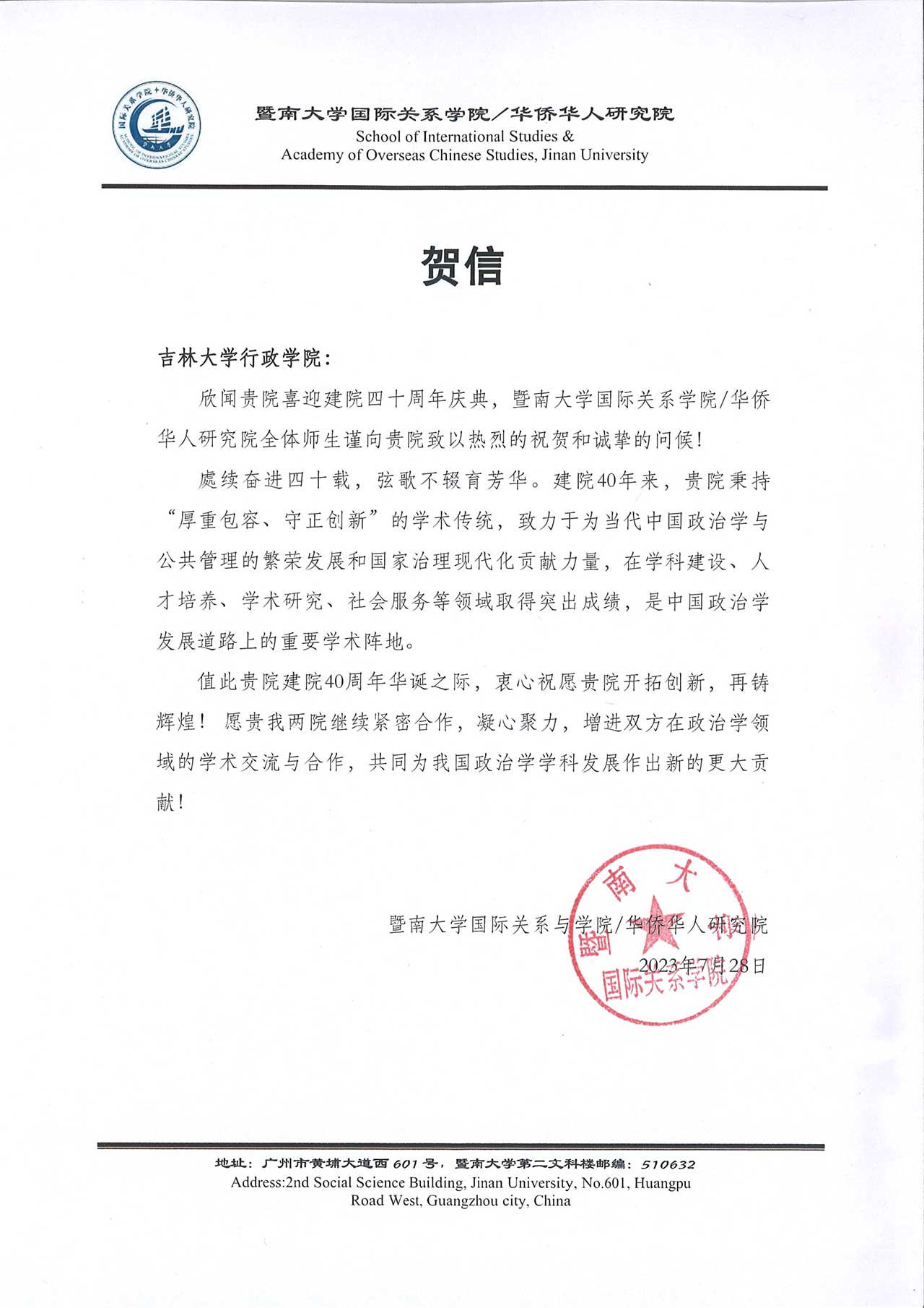 暨南大学国际关系学院的贺信