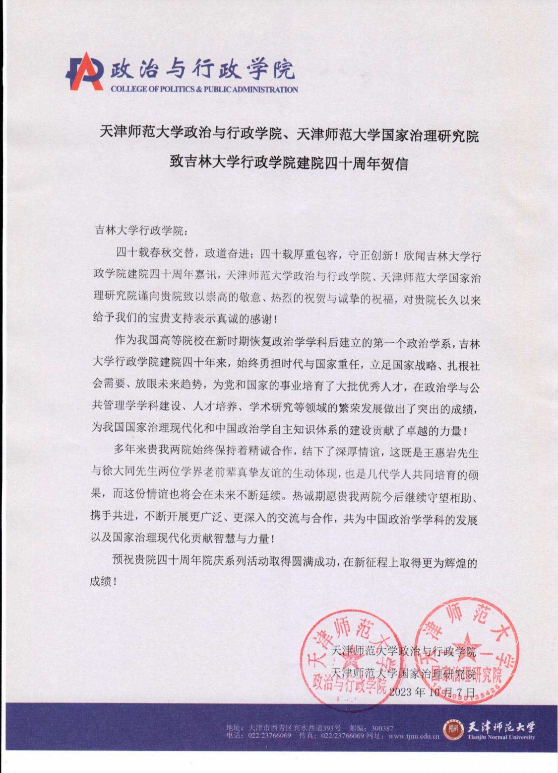天津师范大学政治与行政学院、国家治理研究院的贺信