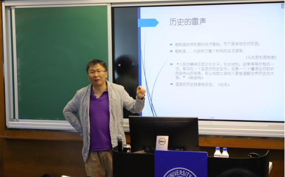 张长东为同学们带来了以“税收国家转型及其对国家社会关系的影响”为主题的课程。张长东首先介绍了课程的研究背景和意义,并向同学们讲述了何为税收以及何为税收体制,介绍了税收国家转型为国家社会关系带来的影响。他引用十八届三中全会决议的话指出,财政是国家治理的基础和重要支柱,科学的财税体制是实现国家长治久安的制度保障。