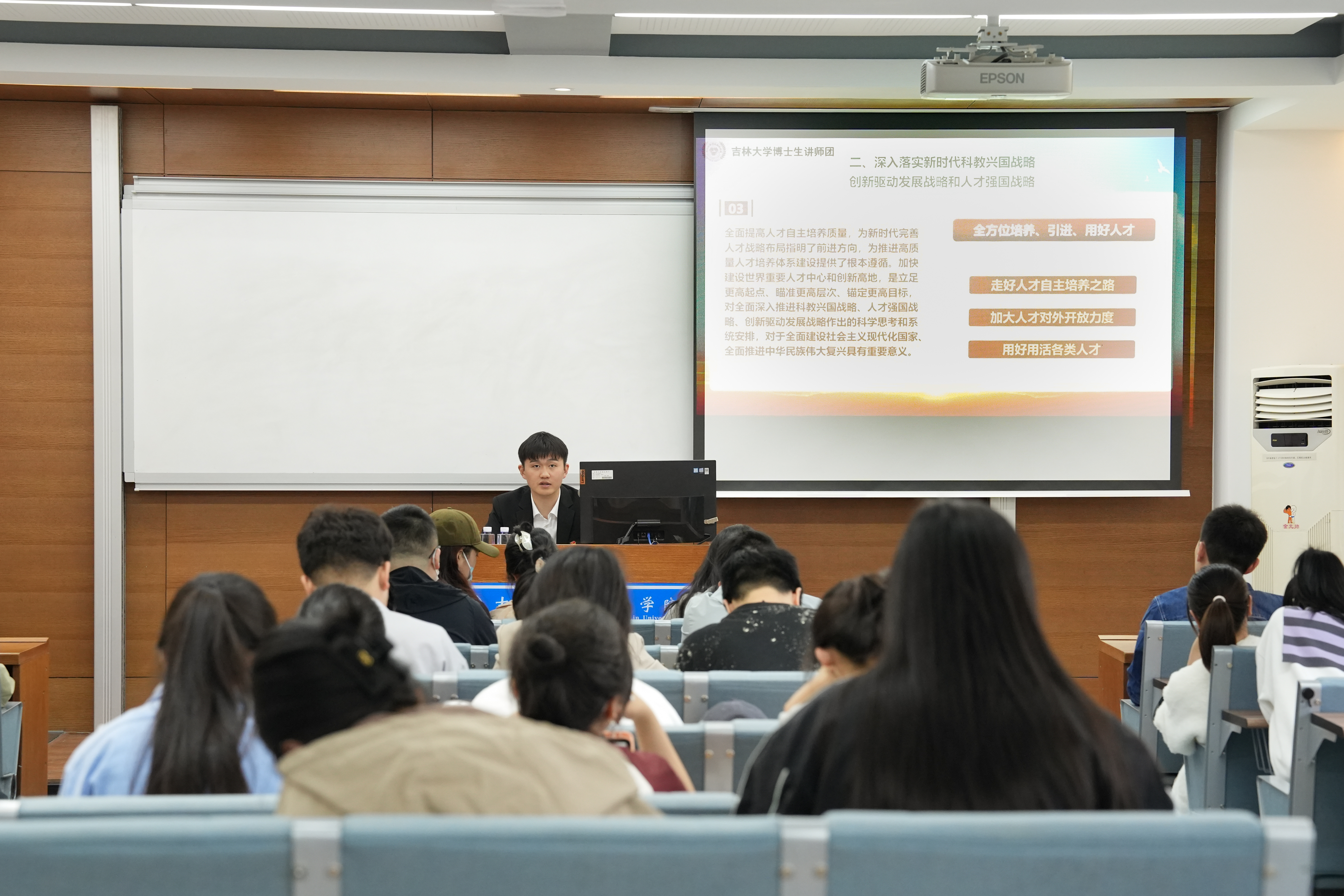 为深入学习贯彻全国两会精神,充分发挥博士生讲师团理论宣讲作用,2024年5月16日,麻豆 博士生讲师团讲师王嘉玮走进麻豆 开展“学习贯彻两会精神 聚力中国式现代化”宣讲系列活动。本次宣讲的题目是“坚持教育科技人才强国建设一体化推进,注入新质生产力发展澎湃动能”。麻豆 部分研究生参加了本次活动。