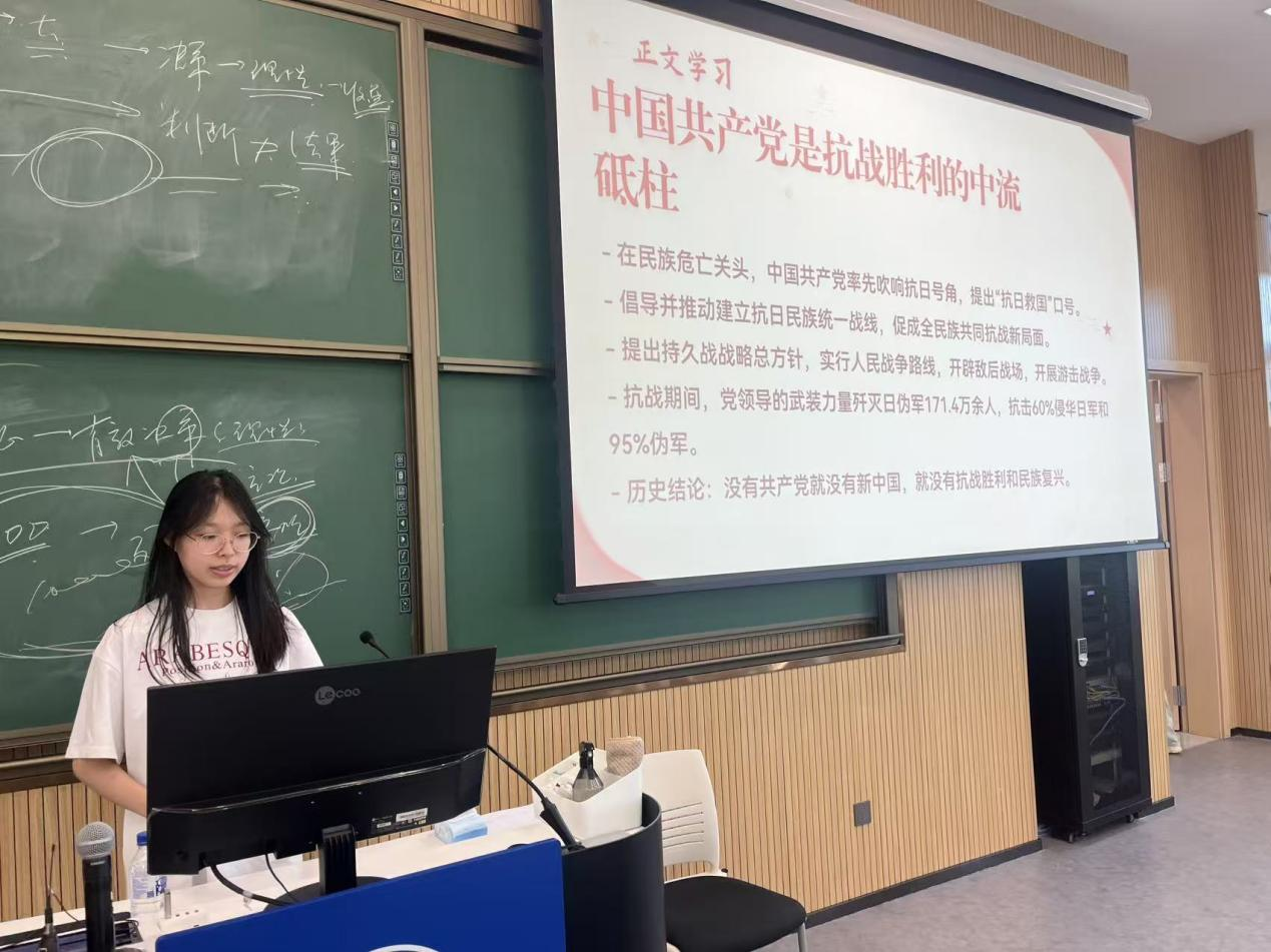 学习解读环节,裴嘉琳(2023级本科生)简单介绍了本次团课的主题及学习目标,带领全体团员重温抗日战争关键历史节点,重点解读“中国共产党的中流砥柱作用是抗战胜利的关键”这一核心结论,结合八路军、新四军敌后抗战的史实,以及171.4万余日伪军歼灭数、19块抗日民主根据地等关键数据,直观呈现中国共产党在“要不要抗战、依靠谁抗战、怎样抗战”三个根本问题上的引领作用。