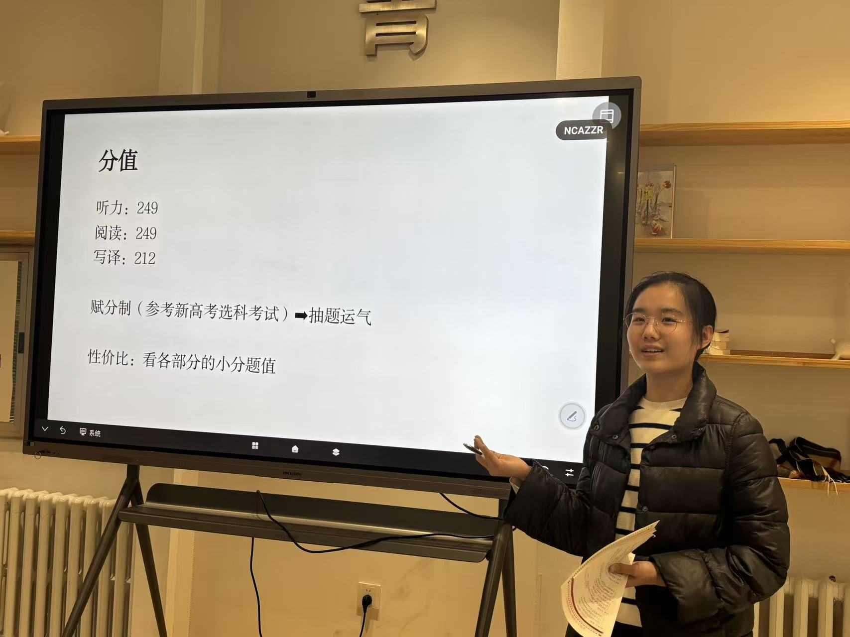 孙逸然(2024级本科生)从通用能力、竞赛备考、雅思备考三方面介绍经验。鼓励大家增加词汇量储备、多听多练习题、积累作文模板,同时结合自身竞赛和考试经验提出建议,并向大家分享了英语学习的资源。