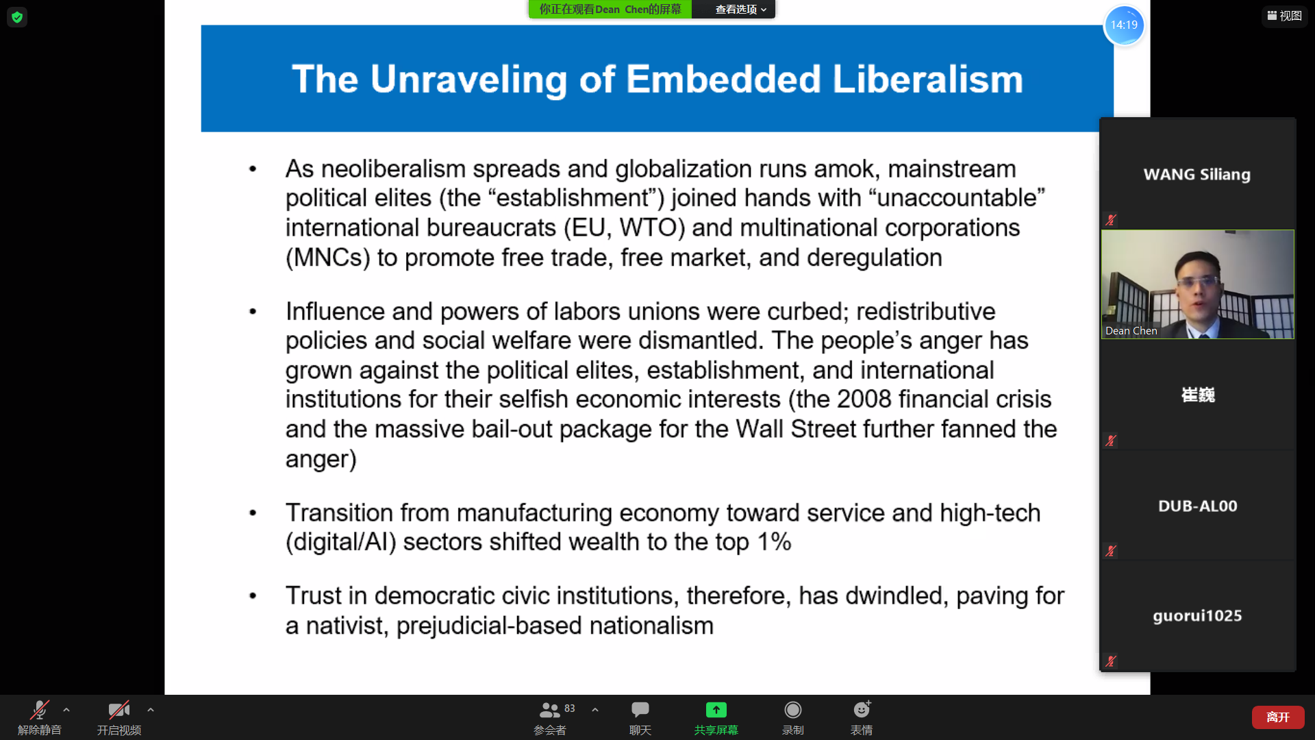 主办的国际事务工作坊第6期学术活动于在线平台举行。本次讲座邀请美国新泽西州拉马波学院副教授陈鼎(Dean Phillip Chen)担任主讲嘉宾,作了题为“民粹主义-民族主义:对政治和国际事务的影响(Populist-Nationalism: Implications for Politics and International Affairs)”的在线学术讲座。学院国际政治系主任郭锐教授担任主持人,共80余名校内外师生参与讲座。