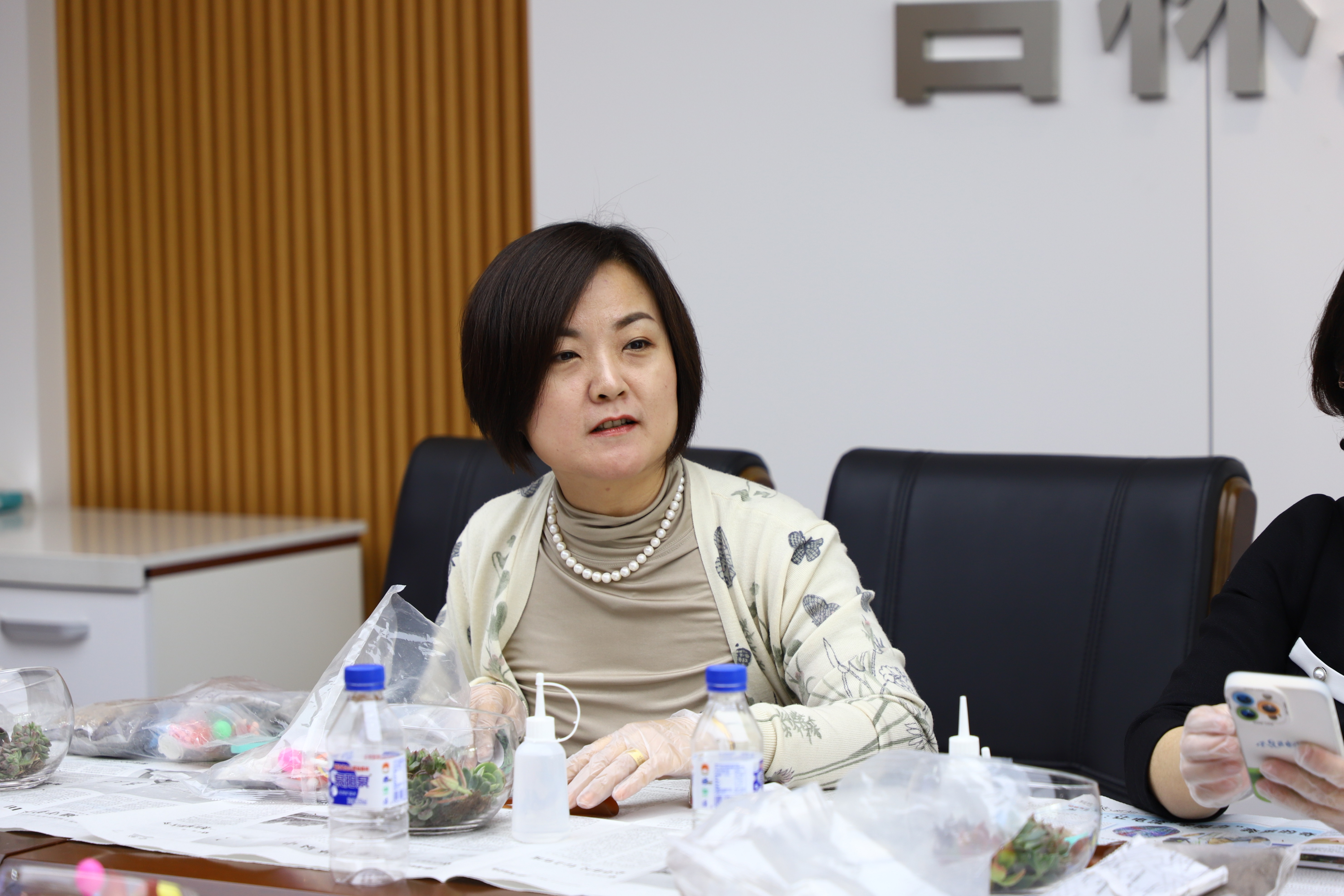 在学院妇委会副主任王欣老师的指导下,参加活动的女性教职工们按照步骤依次在盆景容器中放入轻石、水苔、腐殖土,在搭建好基础土壤后植入绿植和多肉,最后铺上景观砂石和装饰摆件,获得了属于自己独一无二的盆栽摆件。